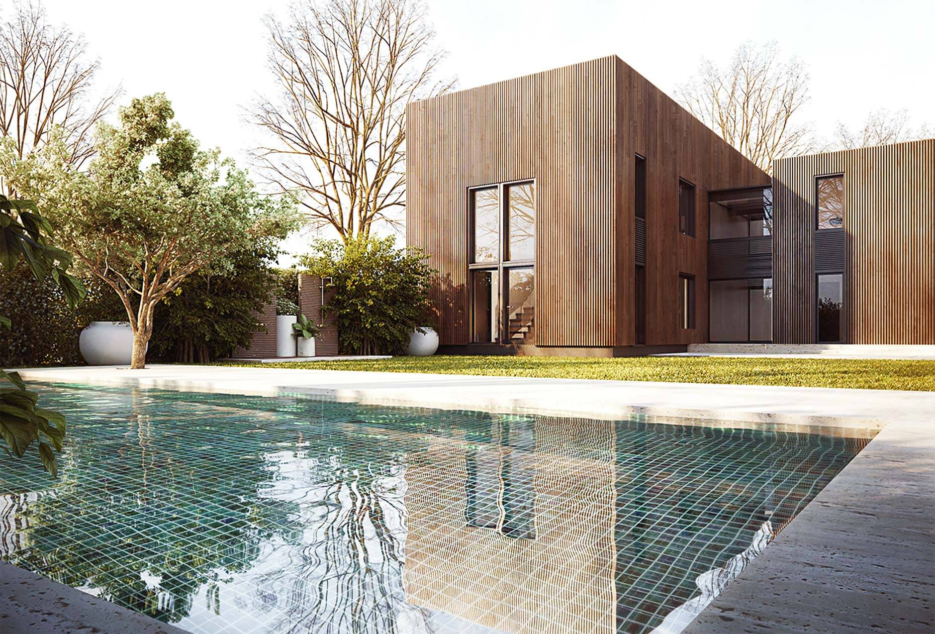 There are three basic materials for covering: wood, metal and ceramic tiles. We had designed this house with panoramic windows, so we only filled it up with functionality.